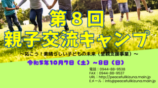 第7回親子交流キャンプ開催概要日時平成30年10月27日(土)13:00~28日(日)12:00終了場所リフレスおおむた(福岡県大牟田市大字四ケ1221番地)開催の様子第6回親子交流キャンプ開催概要日時平成29年10月21日(土)13:00...